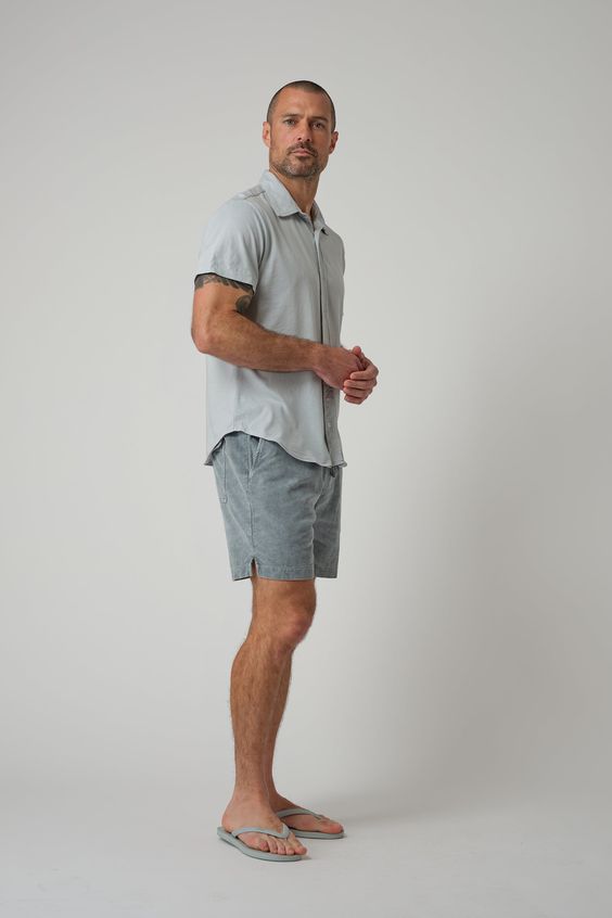 У цьому вбранні світло-сіра сорочка на ґудзиках поєднується з сірими шортами в тон. Монохромний вигляд чистий і мінімалістичний, ідеально підходить для повсякденного літнього стилю.
