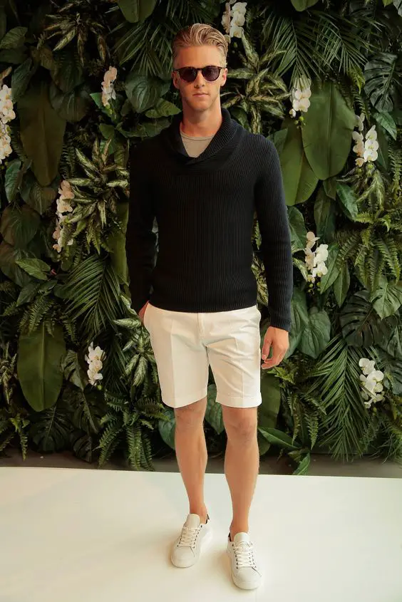 Тут ми бачимо модель у чорному светрі в поєднанні з чіткими білими шортами, що створює вишуканий і позачасовий образ. Контраст між темним верхом і світлим низом одночасно вражаючий і елегантний.