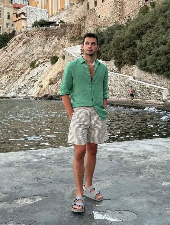 Цей образ ідеально підходить для пляжу: зелена лляна сорочка в поєднанні зі смугастими шортами. Поєднання легке та стильне, що робить його ідеальним для теплих літніх днів.