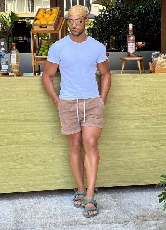 У цьому вбранні біла футболка в поєднанні з коричневими шортами на шнурках створює спортивний і зручний вигляд. Модель доповнена банданою та сонцезахисними окулярами, що додає модний відтінок спортивному стилю.
