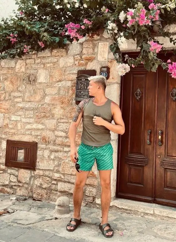 У цьому образі модель випромінює спокійну літню атмосферу з темно-зеленою безрукавкою в поєднанні з яскравими зеленими шортами. Наряд доповнюють чорні босоніжки, що робить його ідеальним для невимушеного літнього дня.