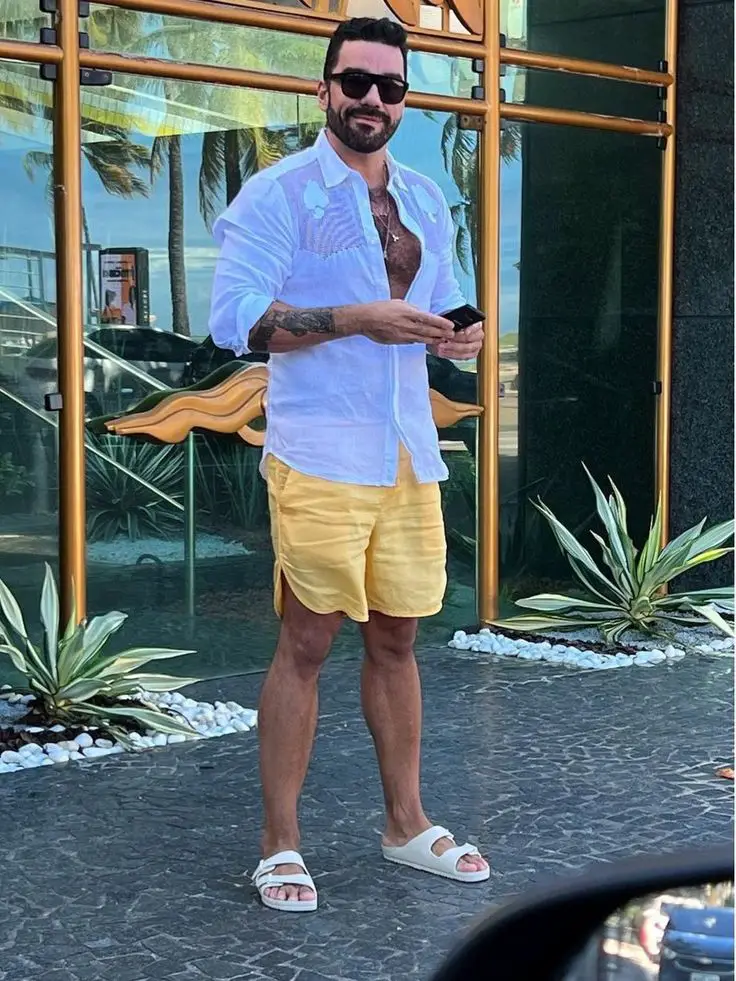 У цьому образі модель поєднує білу сорочку на ґудзиках із яскраво-жовтими шортами. Наряд легкий і повітряний, що робить його ідеальним для сонячного літнього дня.