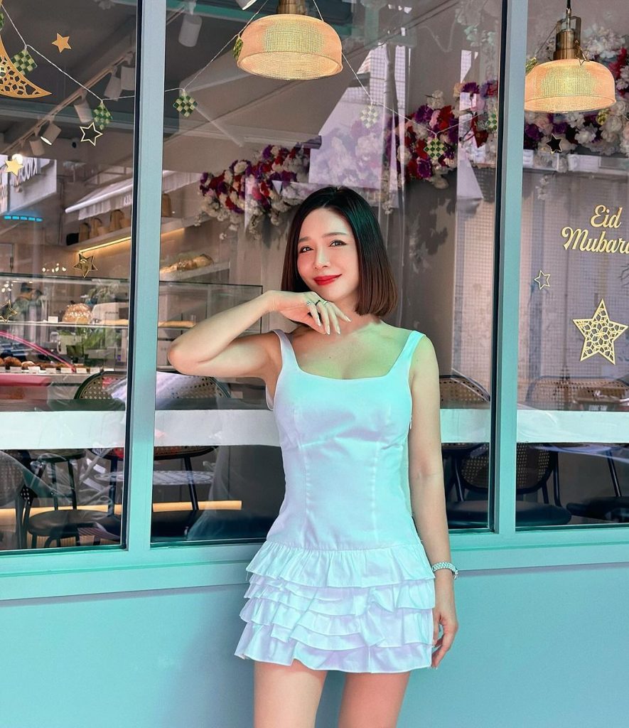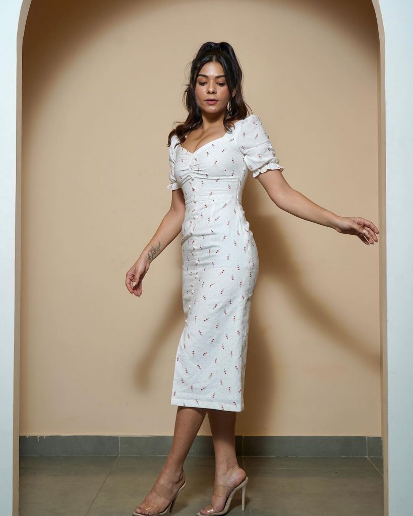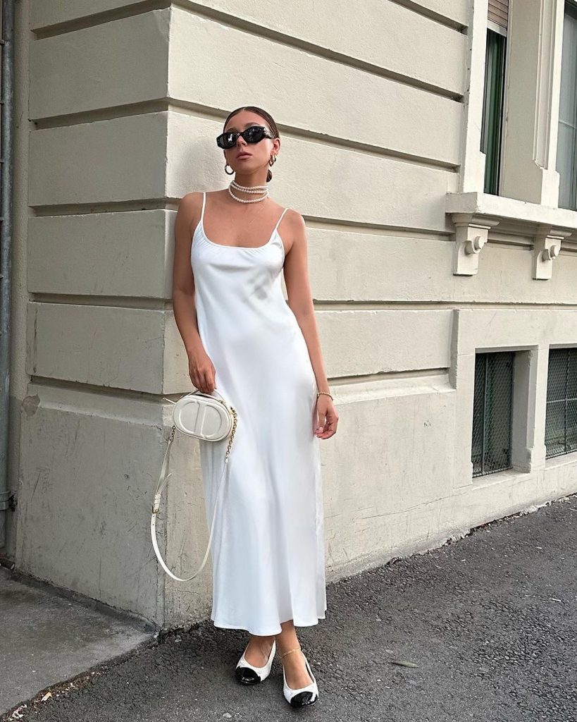 • Аксесуари: образ доповнений мінімалістичними прикрасами та білими туфлями з гострим носом, що підкреслює сучасну естетику сукні.
