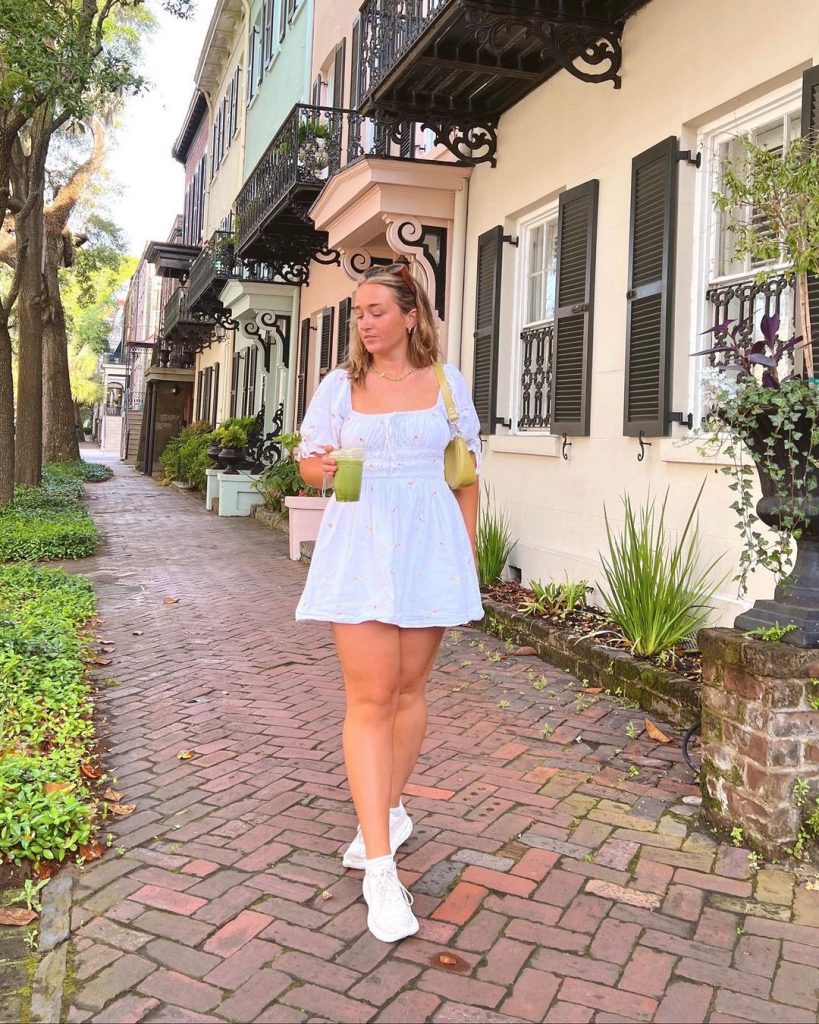 • Аксесуари: у поєднанні з повсякденними білими босоніжками образ виглядає молодіжним і свіжим, підходить для дня на природі чи спокійного світського заходу.