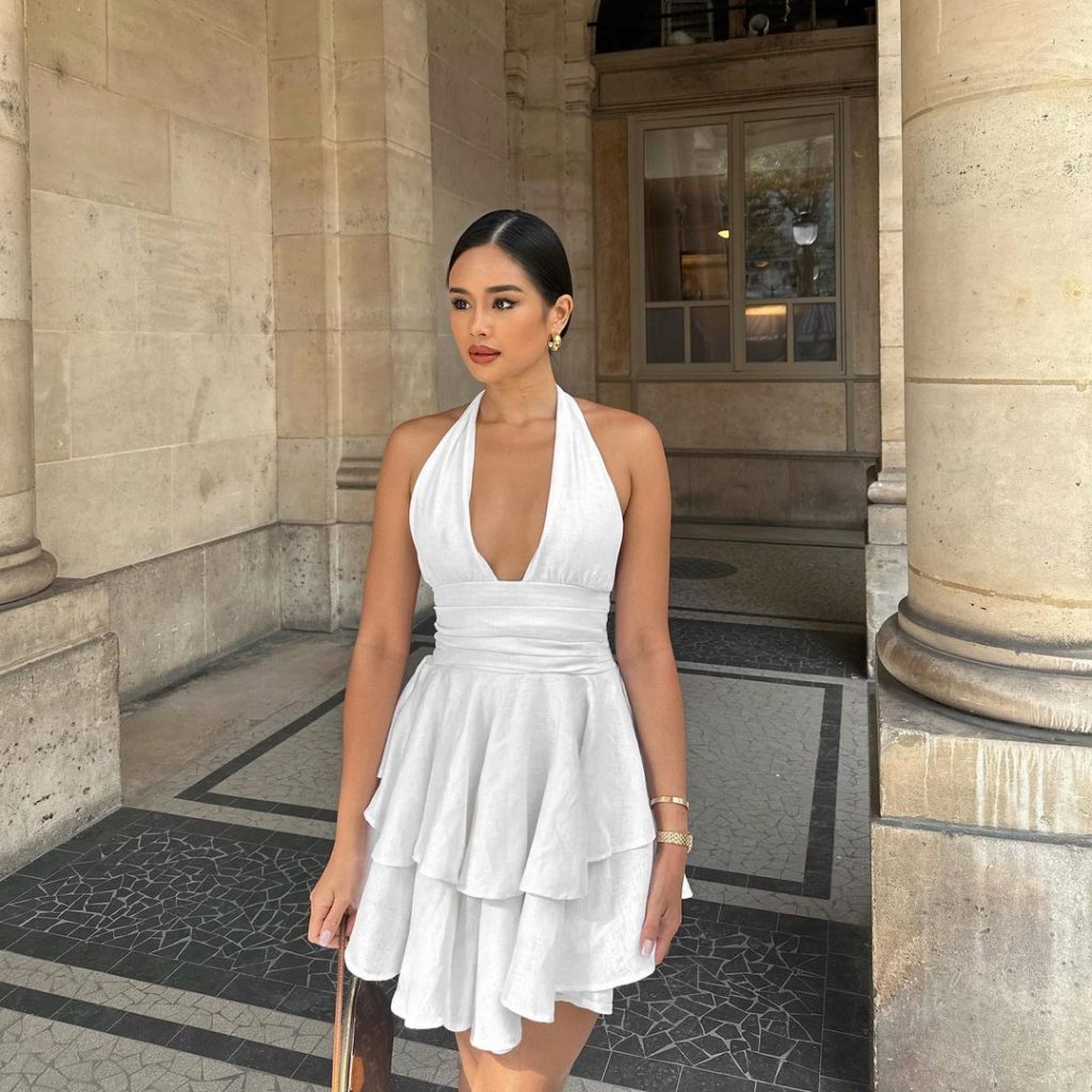 В образі представлена ​​сучасна і грайлива коротка біла сукня розкльошеного силуету, яка ідеально підходить для літньої вечірки чи веселого побачення. Структурований дизайн і деталі з відкритими плечима створюють сучасний відтінок класичної білої сукні.