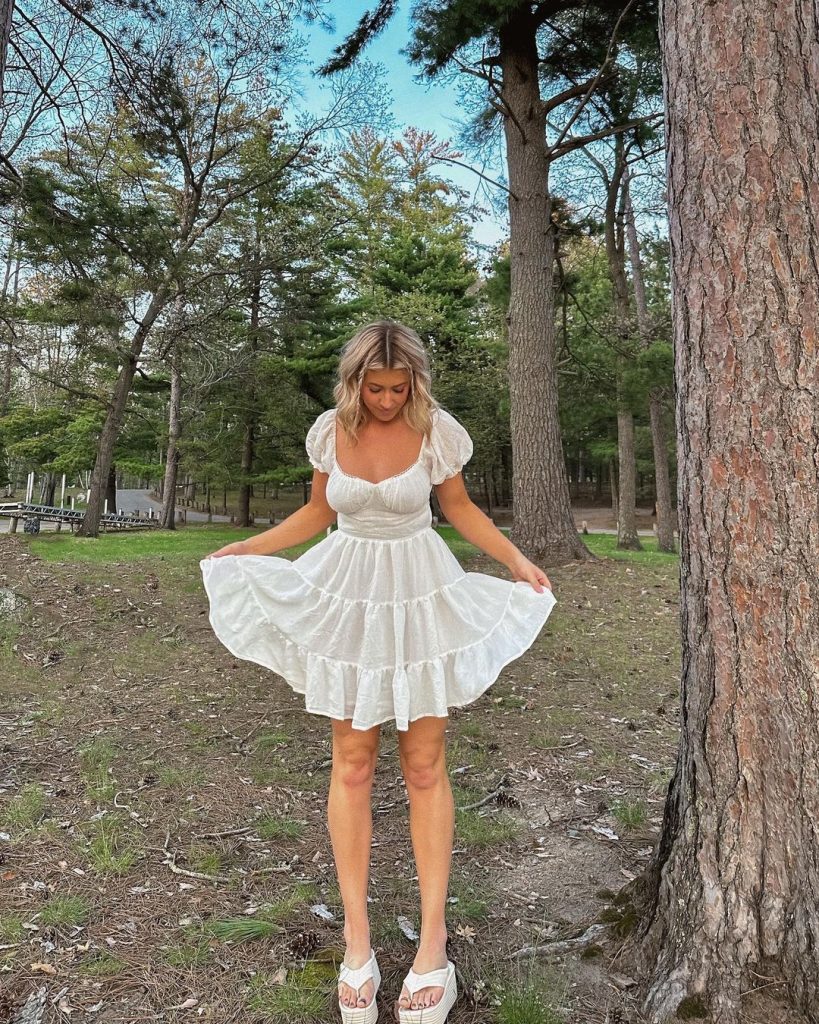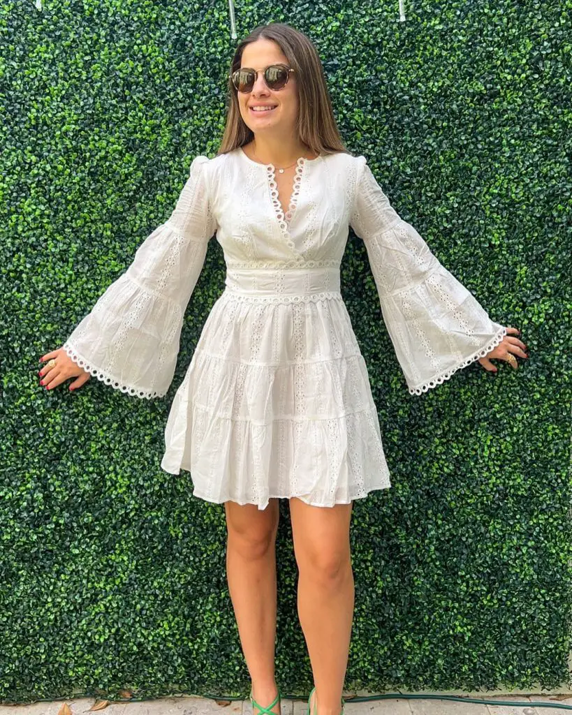 На цьому зображенні повсякденна біла літня сукня ідеально підходить для невимушеного, але стильного образу. Сукня є прекрасним прикладом короткої білої літньої сукні, ідеально підходить для денного виходу або простої літньої зустрічі.