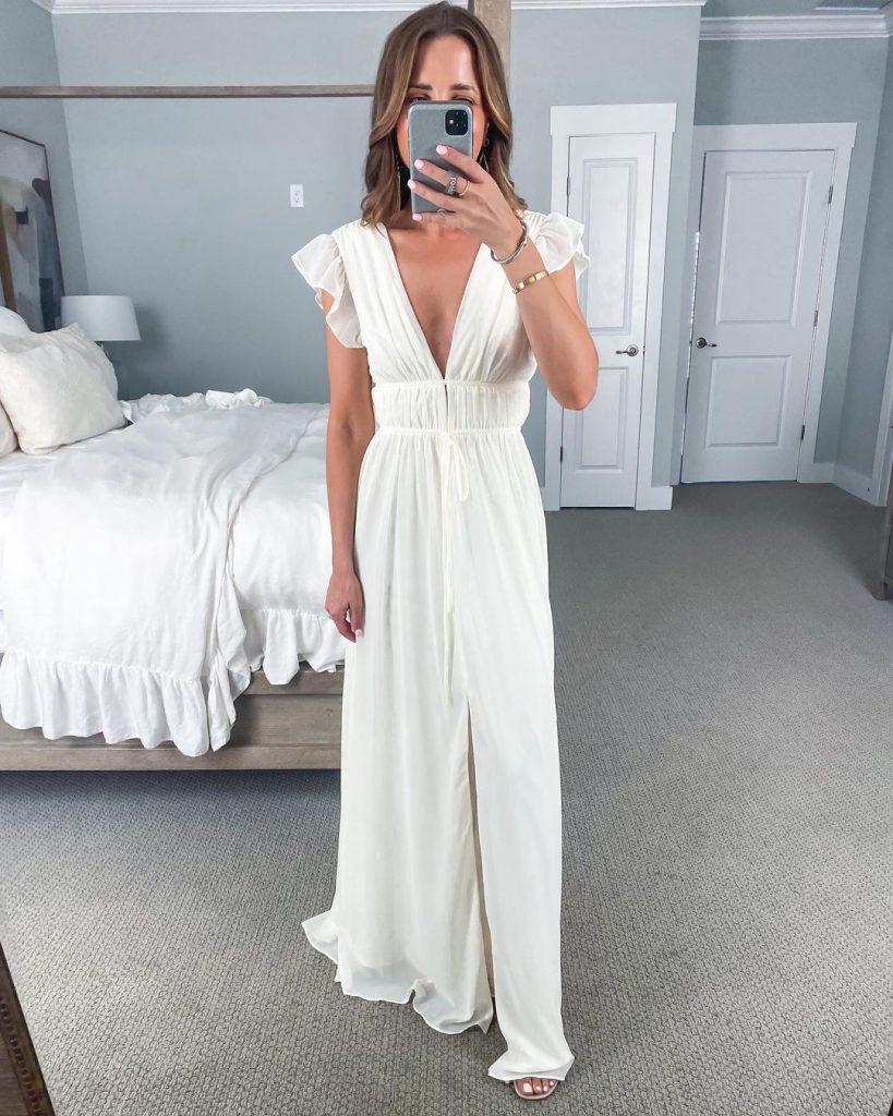 На цьому образі представлена ​​спекотна довга біла сукня з глибоким V-подібним вирізом і високим розрізом, що поєднує в собі привабливість і витонченість. Ця сукня ідеально підходить для елегантних вечорів, коли важливо створити гламурне враження.