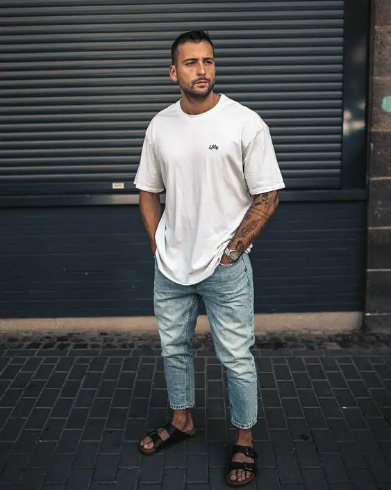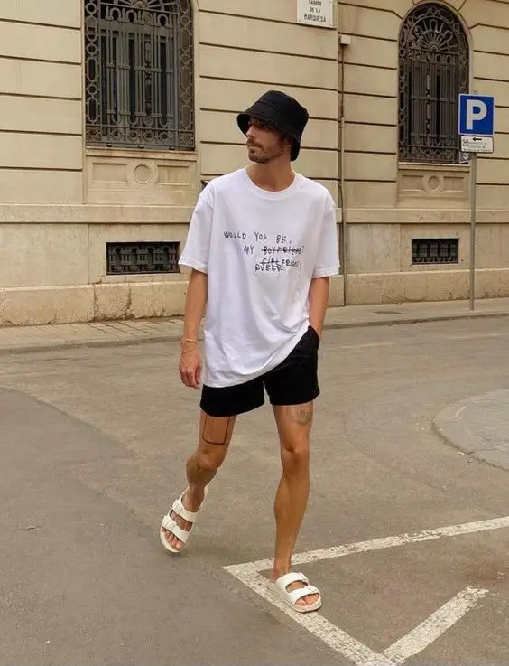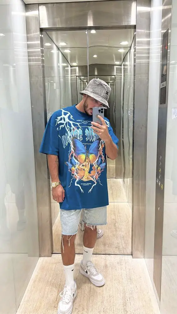 Ось погляд на повсякденне літнє вбрання, яке чоловіки можуть розгойдувати, коли хочуть зробити заяву. Велика футболка з графічним малюнком із потертими джинсовими шортами втілює міський стиль і бунтарський дух.