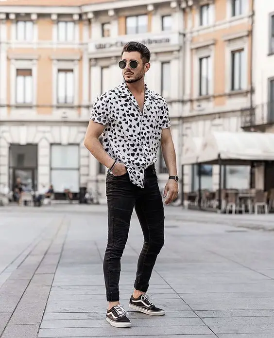 Столичний чоловік знає силу монохроматичної палітри з крапкою візерунка, щоб порушити монотонність. У цьому образі біла сорочка з принтом, заправлена в чорні джинси приталеного крою, забезпечує чудовий баланс між повсякденним літнім одягом, який шукають чоловіки, та міським шиком.