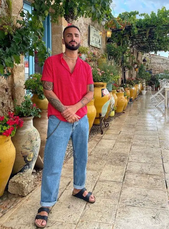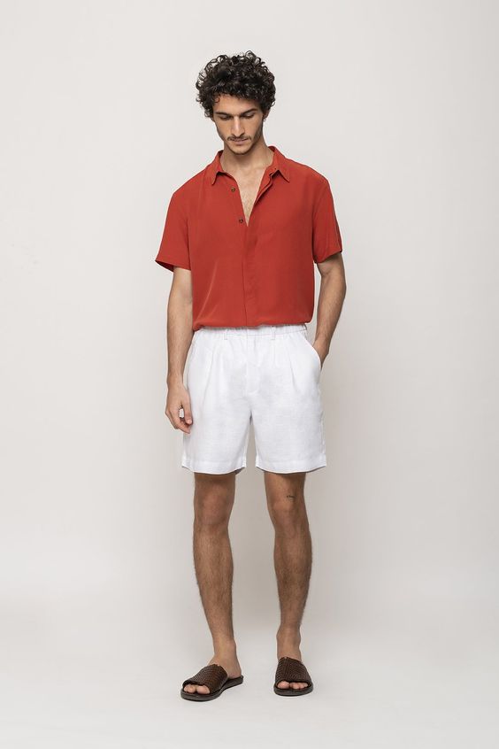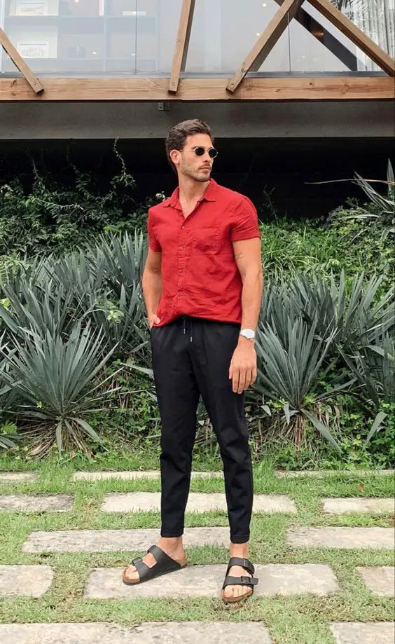 Такий комплект є підтвердженням того, що літні чоловічі шорти можна використовувати в самих різних соціальних ситуаціях. Червона сорочка з короткими рукавами і ґудзиками в поєднанні з облягаючими чорними брюками створює приземлену, але легку атмосферу, ідеальну для літнього вечора.