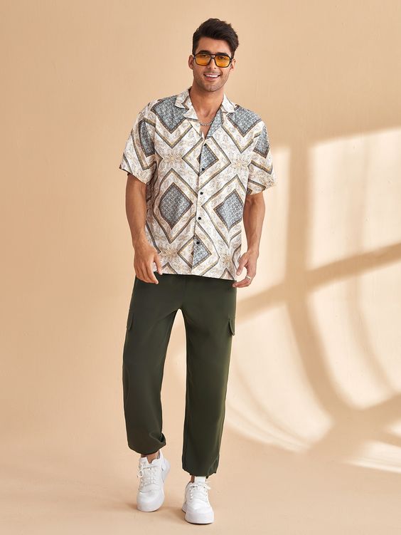 Ось ідеї літнього вбрання, з яких чоловіки можуть черпати натхнення для повсякденного дня або відпустки. Сорочка з геометричним малюнком є яскравим центральним елементом, урівноваженим простими брюками невимушеного крою.