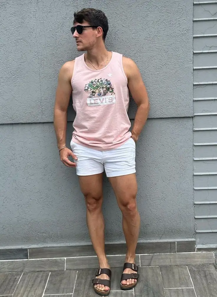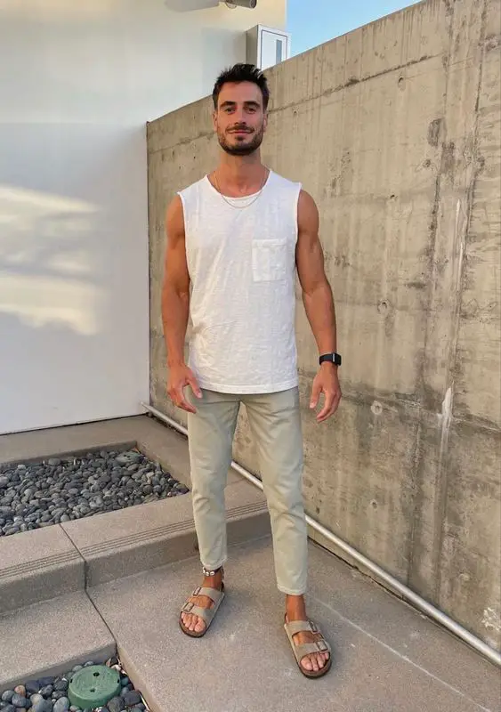У нас є вбрання, яке втілює повсякденне літнє вбрання, яке обожнюють чоловіки в ці спекотні дні. Біла безрукавка без рукавів поєднується з брюками землистих відтінків для вбрання, яке буде таким же свіжим, як і скромним.