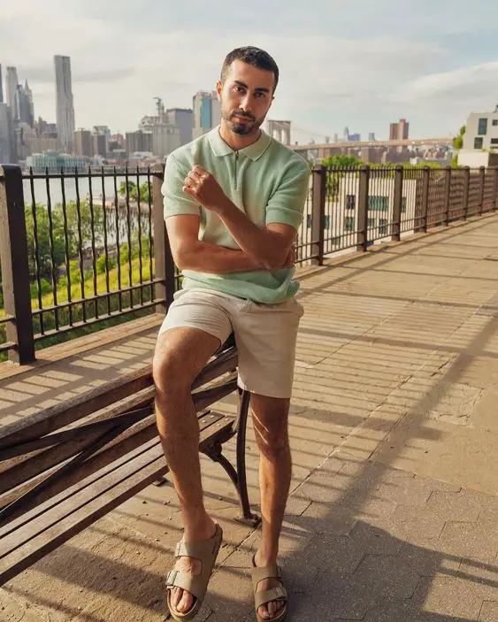 У нашій візуальній подорожі старими грошовими літніми речами чоловічого стилю ми знаходимо ідеальне поєднання ошатного та сучасного. М’ятно-зелене поло в поєднанні з брудно-білими шортами є втіленням свіжого літнього стилю, ідеального для бранчу або дня в яхт-клубі.