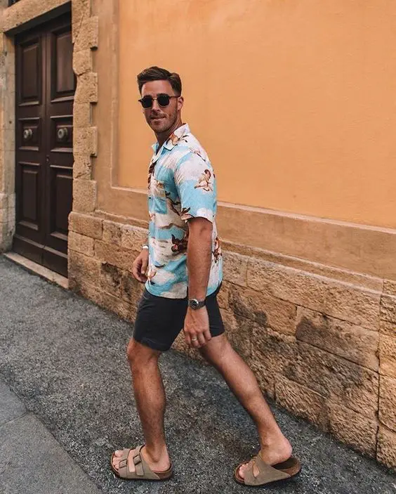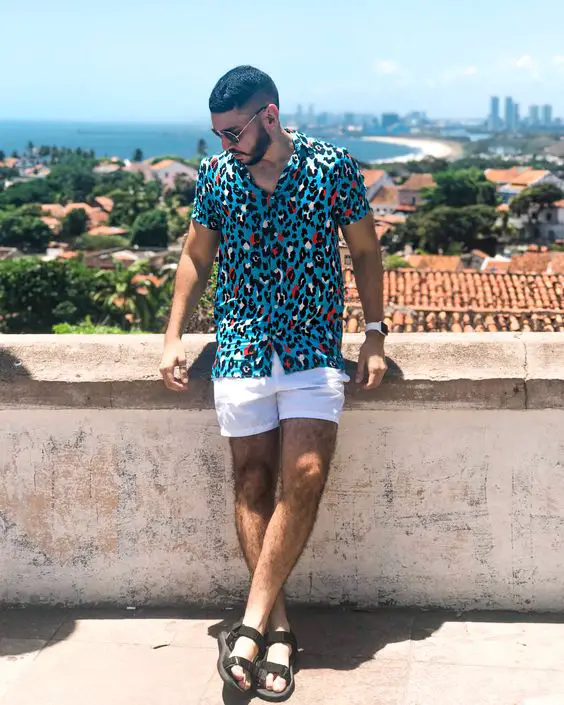 Для чоловіка, який любить морський бриз, цей одяг поєднує в собі тропічний стиль із повсякденним літнім одягом, який сподобається чоловікам у прибережних містах. Яскрава сорочка з леопардовим принтом у поєднанні з чіткими білими шортами — це сміливо, але збалансовано, справжнє літнє твердження про впевненість.
