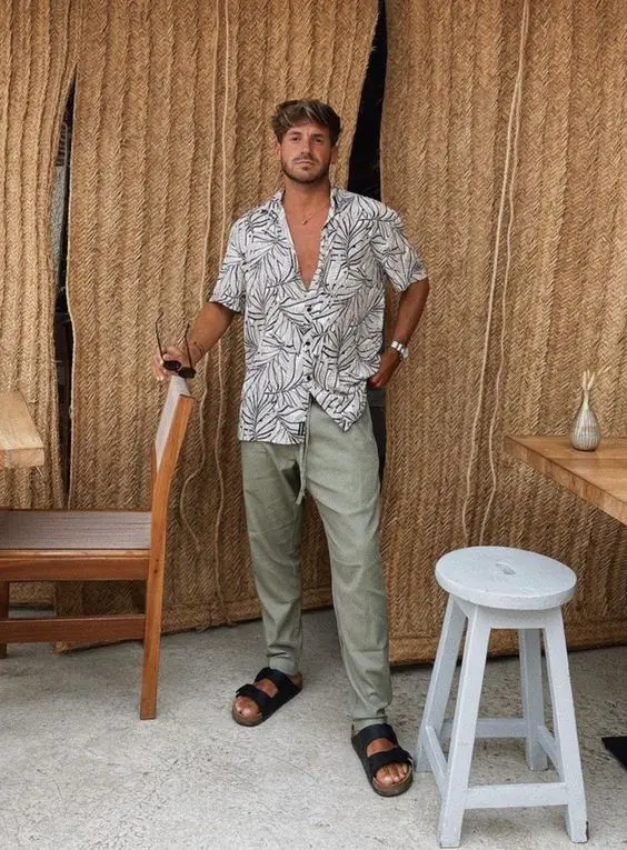 Сорочка з короткими рукавами з принтом у поєднанні з пошитими оливковими брюками, створюючи зображення пишного листя, передає суть повсякденного літнього вбрання, яке чоловіки можуть одягати як для міського життя, так і для відпустки.