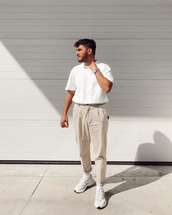 Представляючи мінімалістський погляд на літній робочий одяг, який можуть оцінити чоловіки, цей ансамбль вражає ідеальним акордом між простотою та вишуканістю. Чиста біла футболка та гарно зшиті брюки кольору хакі — чудова пара для сучасного чоловіка, який цінує стриманий стиль.