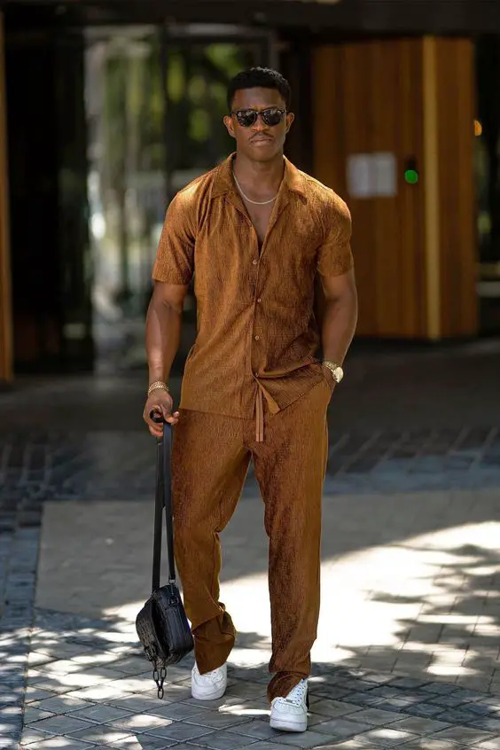 Міська подорож вабить у цьому ансамблі, де насичені землисті тони поєднуються з легкістю ідей літнього вбрання, у якому чоловіки можуть комфортно блукати містом. Комбінований комплект сорочки та брюк із дихаючої тканини доповнюється чіткими білими кросівками, що поєднує елегантність із спортивний край.