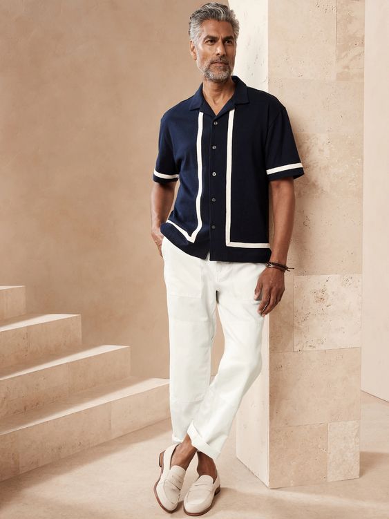 Викликаючи відчуття позачасової елегантності, цей образ демонструє, як старі грошові літні вбрання в чоловічому стилі можуть бути класичними та сучасними. Темно-синє поло з білою окантовкою в поєднанні з брудно-білими брюками випромінює відчуття елітного дозвілля, ідеально підходить для дня в заміському клубі або елегантного вечірнього заходу.