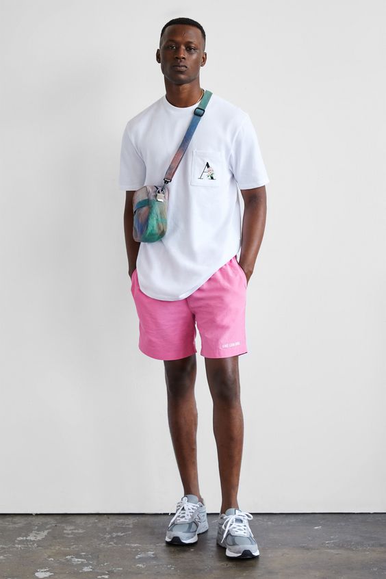 Літо – це не просто прохолода; це про гарячий вигляд. Enter: жирний колір. Цей образ із яскраво-рожевими шортами та чистою білою футболкою привертає увагу, поєднуючи чутливість вуличного одягу з майже пастельною грайливістю.