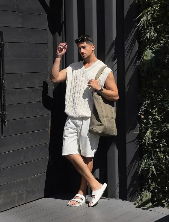 Створити літнє робоче вбрання для чоловіків, які легко переходять із зали засідань на прогулянку містом, може стати справжньою головоломкою. Це зображення представляє ансамбль, який з апломбом доповнює цей трус. Текстурована трикотажна жилетка поверх чітких білих шортів — це дослідження балансу між вишуканістю та літнім комфортом.