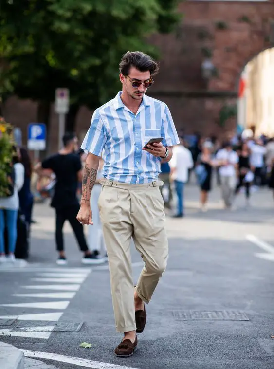 Цей стильний одяг поєднує чоловічий стиль старих грошей із літнім одягом із сучасним пошиттям. Смугаста сорочка, заправлена в добре підібрані штани, демонструє позачасову привабливість, яка ідеально підходить для літнього дня чи елітного сніданку.
