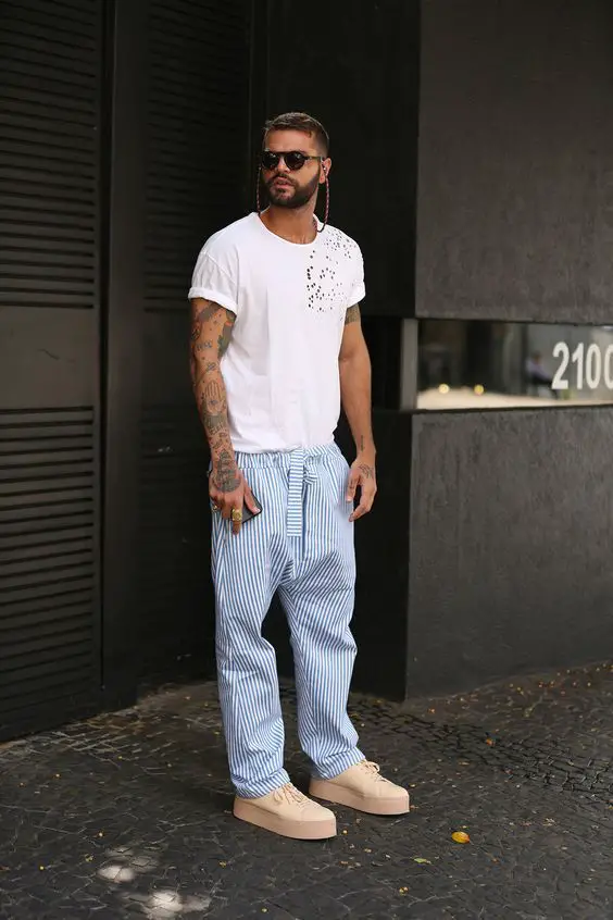 Поєднання простої білої футболки з яскравими смугами цих штанів створює освіжаючий погляд на літні чоловічі шорти. Чіткі лінії та сміливі візерунки говорять про впевненого чоловіка, якому подобається класичний літній одяг.