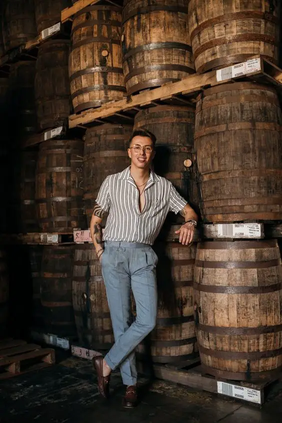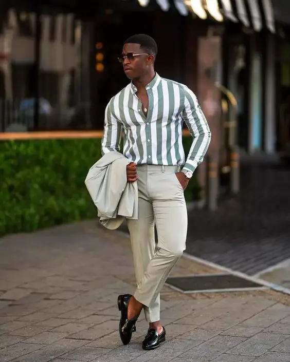 Цей образ поєднує в собі смугасту сорочку та бежеві штани, створюючи вишуканий, але сміливий літній чоловічий образ. Ідеальний як для повсякденних, так і для напівофіційних випадків, він забезпечує ідеальний баланс між розслабленістю та вишуканістю.