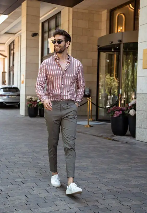 У цьому вбранні червоно-біла смугаста сорочка та сірі брюки чинос створюють невимушений, але вишуканий чоловічий повсякденний літній образ. Дихаючий матеріал і невимушений крій роблять його ідеальним для теплих днів, забезпечуючи комфорт і стиль.