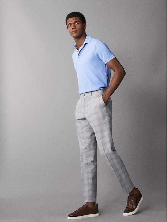 Цей одяг демонструє блакитну сорочку поло в поєднанні з сірими картатими брюками, створюючи естетику літнього чоловічого вбрання, яке є одночасно крутим і сучасним. Ідеально підходить для повсякденних або напівофіційних заходів, він пропонує чистий і сучасний вигляд.
