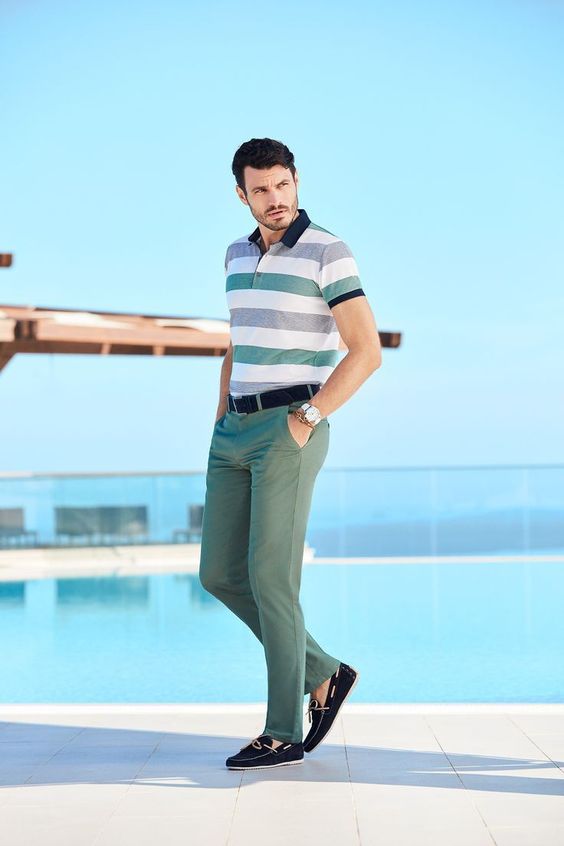 Цей одяг поєднує в собі смугасту сорочку поло та зелені брюки, створюючи свіжий і яскравий літній чоловічий образ. Завдяки повітропроникним тканинам і спеціальному крою він ідеально підходить для теплих днів біля басейну або звичайного дня.