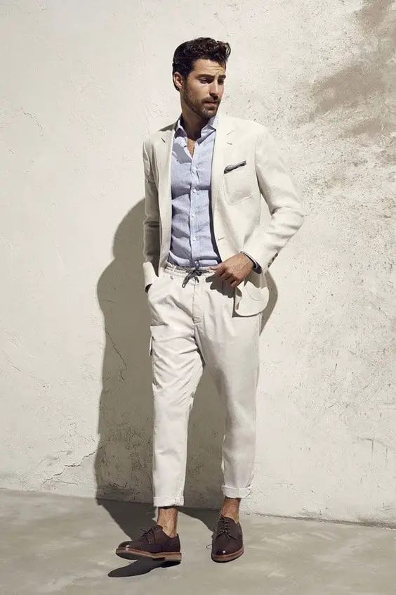 Цей образ включає лляний костюм у поєднанні з світло-блакитною сорочкою, що є прикладом літнього чоловічого вбрання в пляжному стилі. Ідеально підходить для пляжних весіль або літніх вечірок, він поєднує в собі елегантність і комфорт.