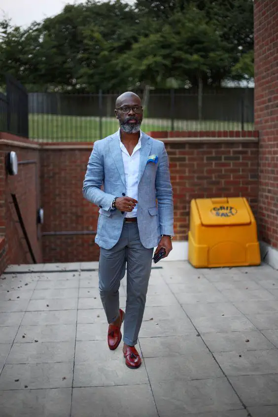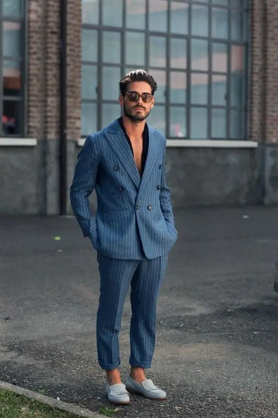 Цей наряд є чудовим зразком естетики літнього чоловічого вбрання, що поєднує сміливі кольори з класичним пошиттям. Світло-блакитний піджак і темні штани створюють яскравий контраст, що робить його ідеальним як для денних, так і для вечірніх заходів.