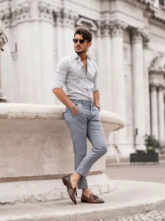 У цьому вбранні сорочка з малюнком поєднується з легкими брюками, створюючи стильний літній чоловічий наряд, який підходить для різних повсякденних випадків. Комбінація ідеальна для літніх днів, пропонуючи комфорт і стиль.
