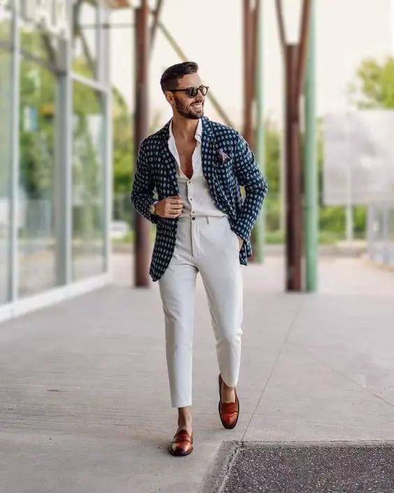 Цей образ демонструє блейзер з принтом у поєднанні з білими брюками, пропонуючи сміливий і модний літній одяг для чоловіків. Ідеально підходить для стильних зустрічей або вечірніх прогулянок, він поєднує сучасність з елегантністю.