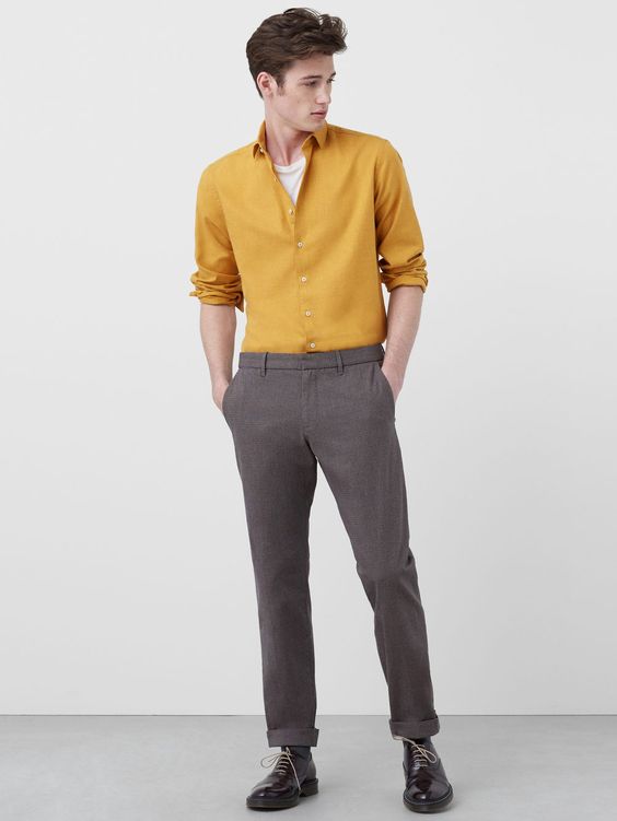 Гірчична сорочка і сірі штани