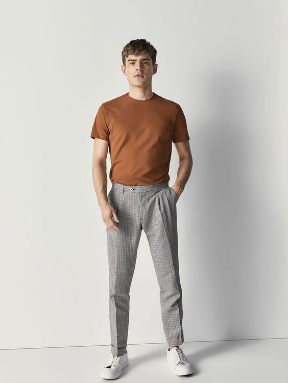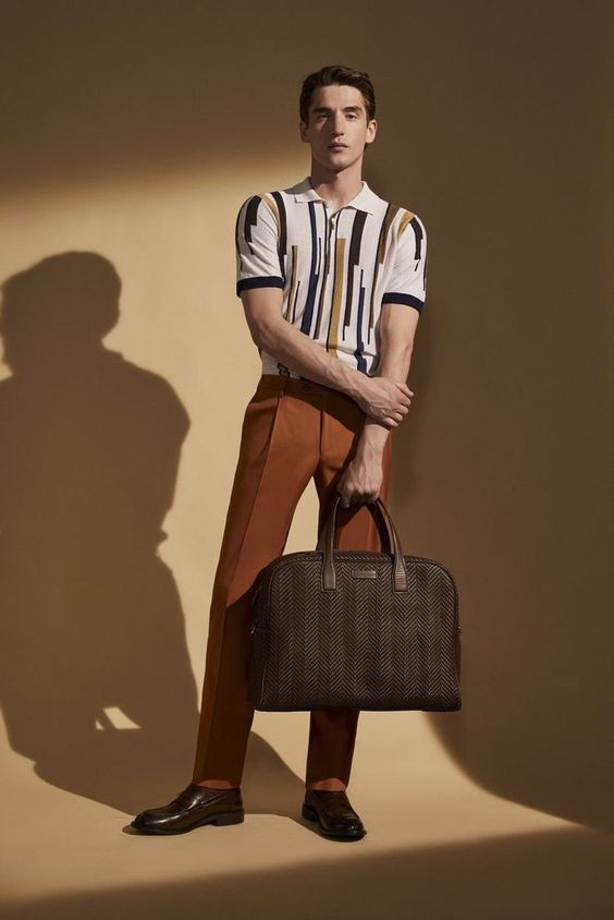 Це вбрання є ідеальним прикладом літнього чоловічого вбрання, яке сприймає ретро-атмосферу з сучасним відтінком. Сорочка з геометричним принтом і штани кольору іржі створюють вражаючий образ, який ідеально підходить для людей, які прагнуть моди.
