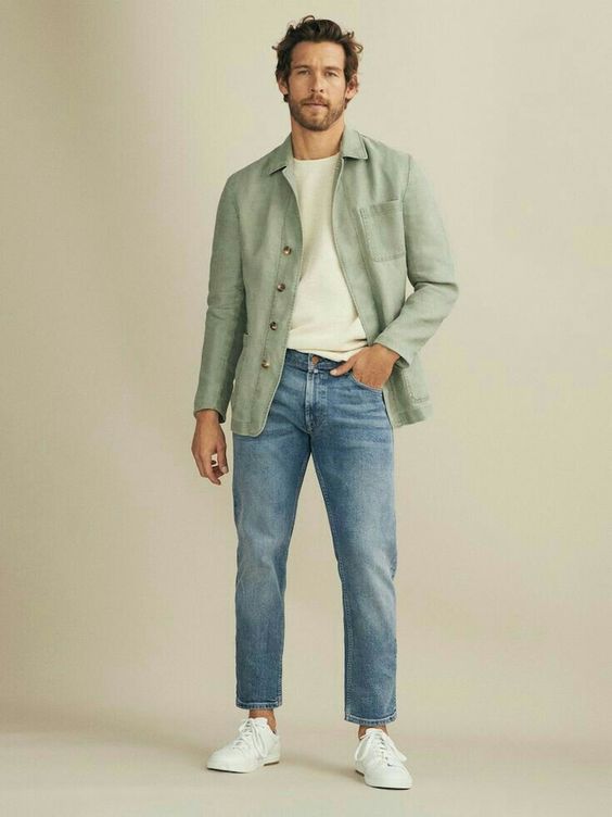 Цей образ поєднує в собі зелений лляний піджак, білу футболку та сині джинси, створюючи зручний і стильний літній чоловічий наряд. Завдяки повітропроникним тканинам і вільному крою вони ідеально підходять для повсякденних прогулянок або дня в місті.