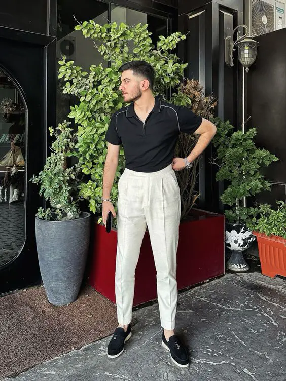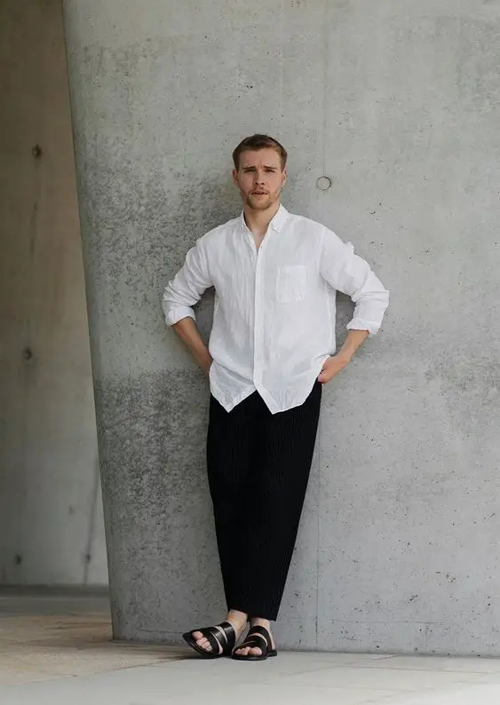 Цей одяг підкреслює тенденцію літнього чоловічого одягу з білої льняної сорочки та чорних штанів. Цей образ ідеально підходить для спекотної погоди, зручний і стильний.