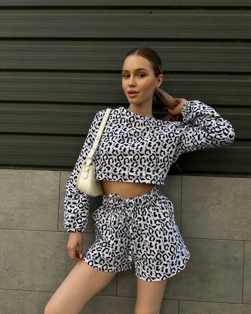 Цей чорно-білий набір одягу для відпочинку з леопардовим принтом включає укорочений топ з довгими рукавами та шорти в тон. Грайливий принт і зручний крой роблять його ідеальним для повсякденних, невимушених днів.