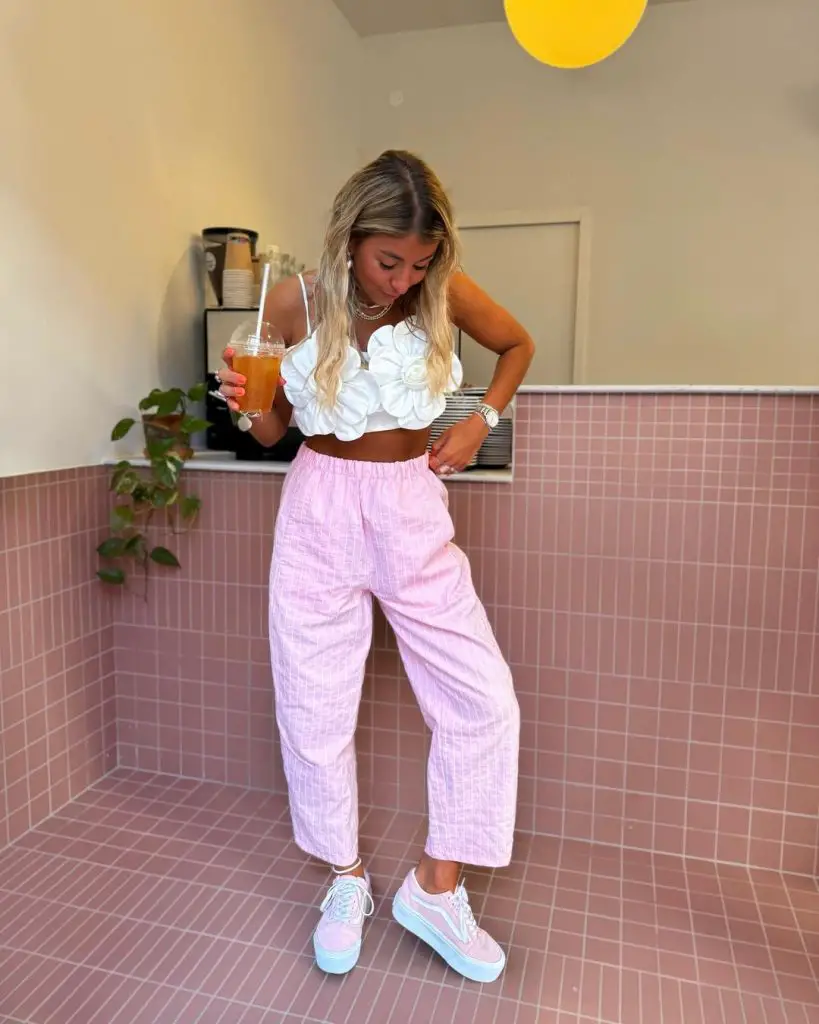 У цьому грайливому вбранні білий кроп-топ із квітковим принтом у поєднанні з рожевими штанами в смужку створює свіжий і веселий літній образ. Ніжні квіткові деталі на верху додають нотку жіночності, а розслаблений крій штанів забезпечує комфорт.