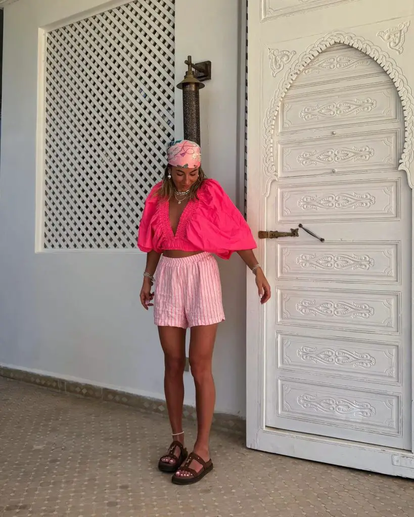 Цей яскравий комплект включає яскраво-рожевий кроп-топ з балонними рукавами та смугасті шорти з високою талією. Сміливі кольори та грайливий дизайн роблять його ідеальним для літніх пригод.