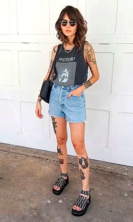 Цей повсякденний образ поєднує в собі безрукавку з графічним малюнком і джинсові шорти з високою талією, що ідеально підходить для невимушеного літнього дня. Графічний дизайн додає індивідуальності, а шорти забезпечують комфорт і стиль.