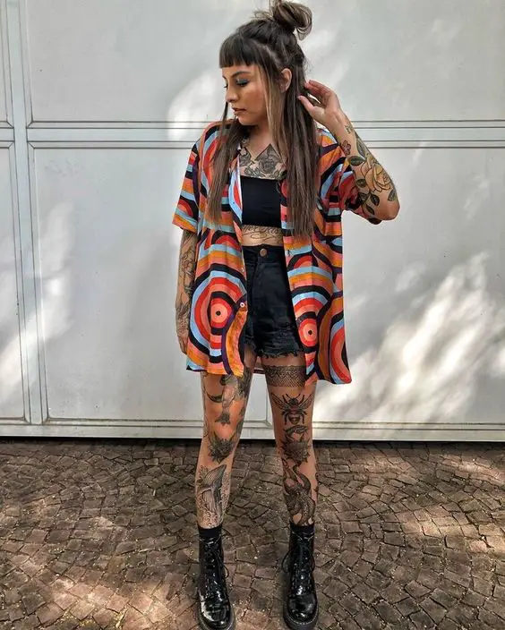 Одяг у стилі гранж із чорною великою футболкою з графічним малюнком, накинутою поверх неонових довгих рукавів. У цьому образі вуличний стиль поєднується з нотками панку, ідеально підходить для того, щоб підкреслити себе.