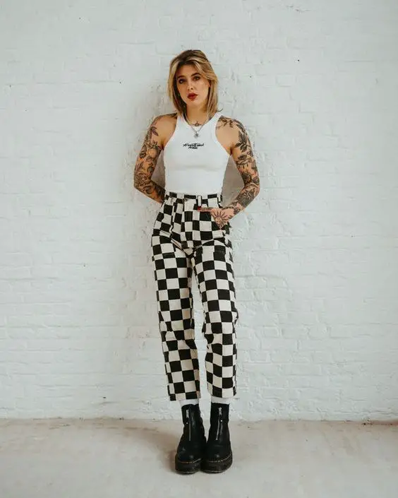 У цьому монохромному вбранні штани в клітинку в поєднанні з простою білою безрукавкою створюють сміливий, але мінімалістичний образ. Високий контраст і чисті лінії роблять це вбрання помітним.