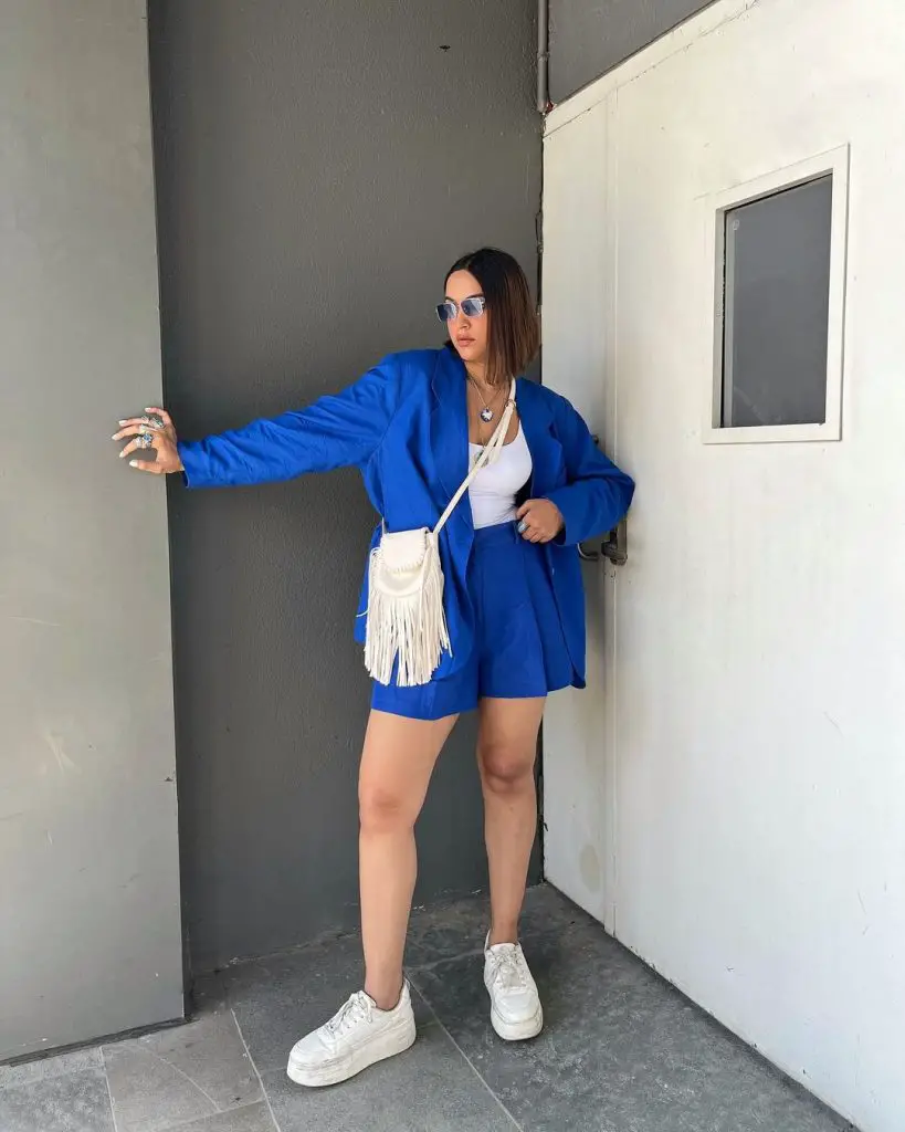 Яскравий синій піджак і шорти в тон створять професійний, але різкий літній образ. Яскравий колір і структурований силует роблять цей комплект відмінним вибором як для роботи, так і для повсякденного відпочинку.