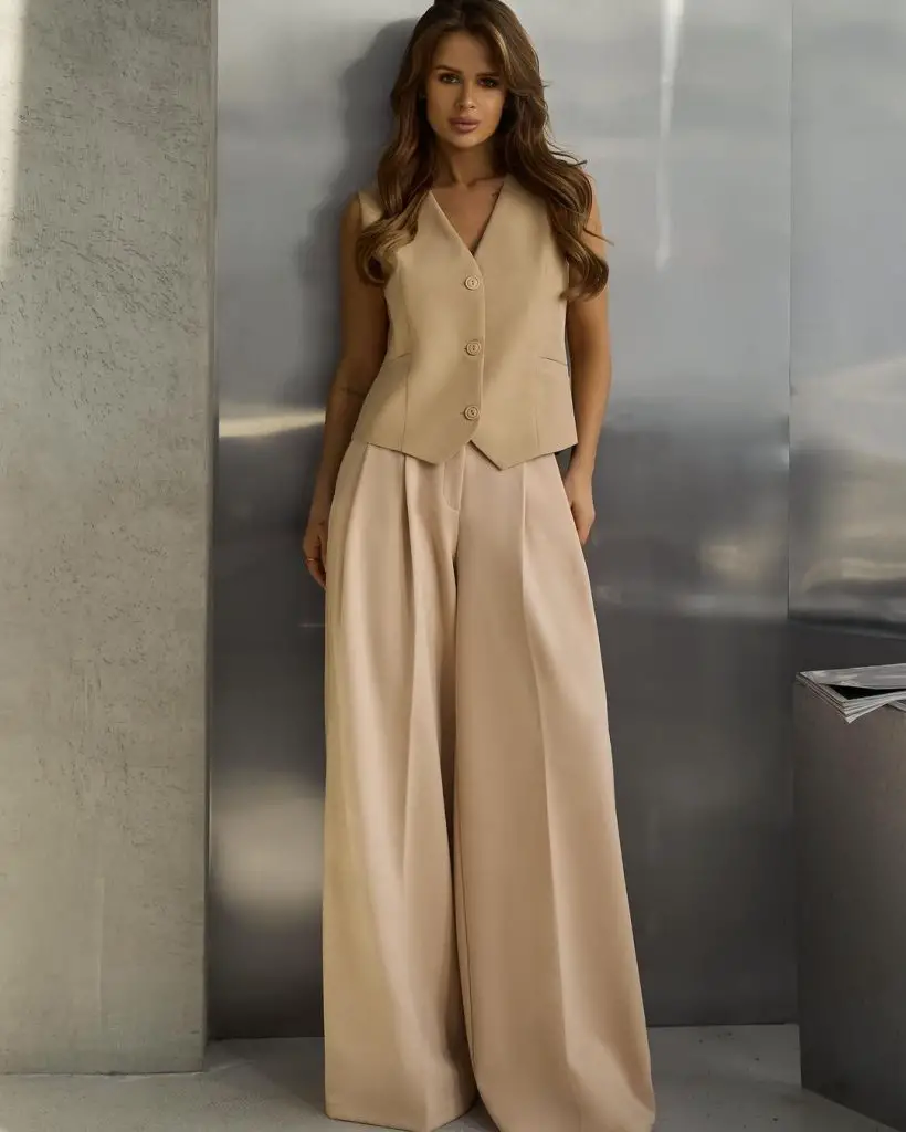 Цей одяг демонструє витончену бежеву жилетку в поєднанні з широкими брюками, створюючи витончений, але різкий образ. Монохромний ансамбль випромінює мінімалістичну елегантність і ідеально підходить для сміливих заяв у професійному середовищі.
