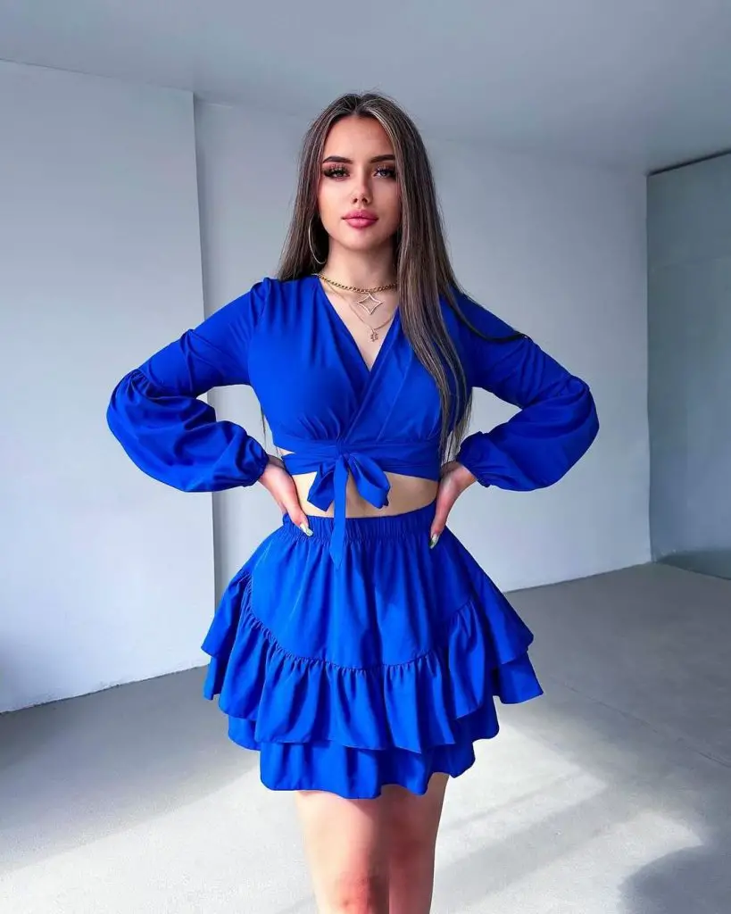 Цей яскравий королівсько-синій комплект із двох предметів складається з короткого топу з довгими рукавами та міні-спідниці з воланами. Сміливий колір і грайливий дизайн роблять його відмінним вибором для літніх свят.