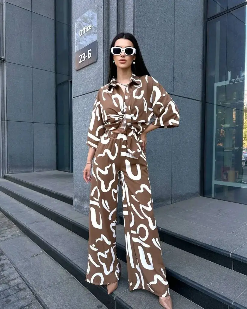 Шикарний коричнево-білий набір з абстрактним принтом поєднує в собі вільну сорочку на ґудзиках і широкі штани з високою талією. У цьому одязі поєднується вишуканість із сучасністю, що робить його ідеальним для різних випадків.