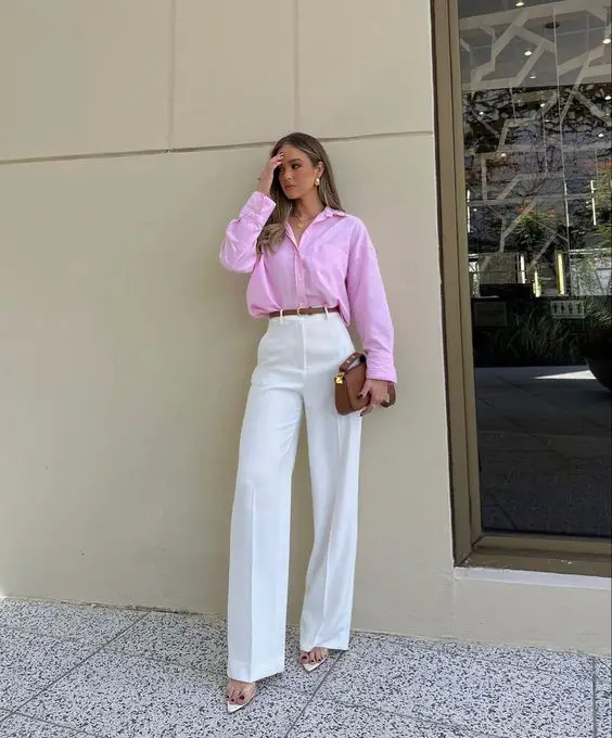 У світі ідей жіночого літнього робочого вбрання колір може стати вашою секретною зброєю. Експонат А: блідо-рожева блузка в бездоганному поєднанні з яскравими білими брюками. Це втілення жіночності, збалансованої з професійною перевагою. Для жінок, які відстоюють елегантність на робочому місці, цей ансамбль нагадує вишуканість, не жертвуючи свіжою атмосферою літа.