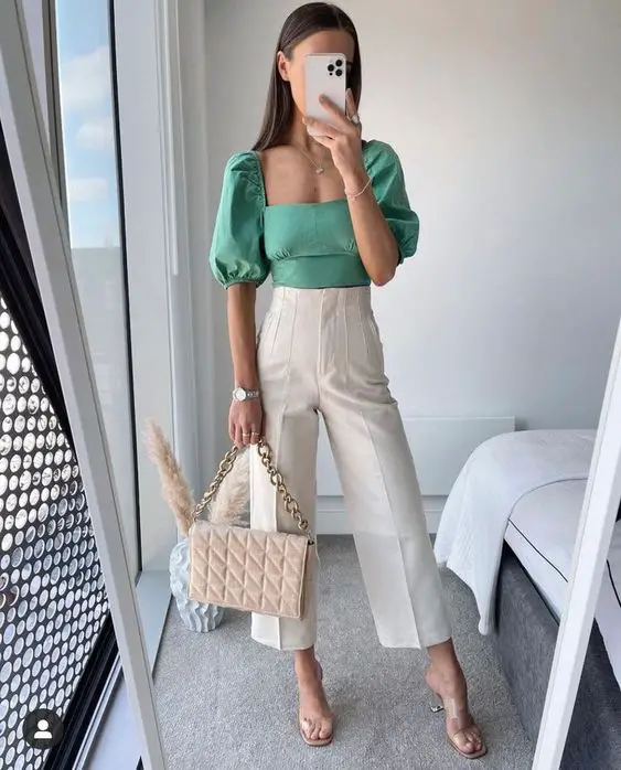 Оскільки ми підбираємо милі літні робочі костюми для жінок, укорочені штани продовжують панувати. Цей особливий стиль, який включає пастельно-зелений укорочений топ і кремові брюки з високою талією, випромінює сучасну елегантність, яку важко ігнорувати.